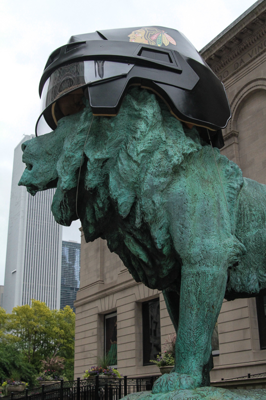 A bronze lion wearing a Blackhawks helmet. Of course.
